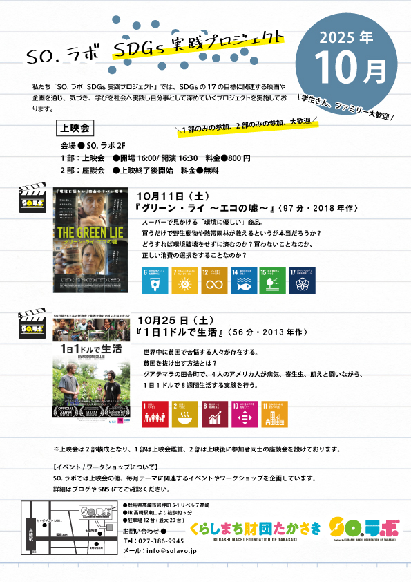2025年10月の、SO.ラボ SDGs 実践プロジェクト 上映会のお知らせをさせていただきます。